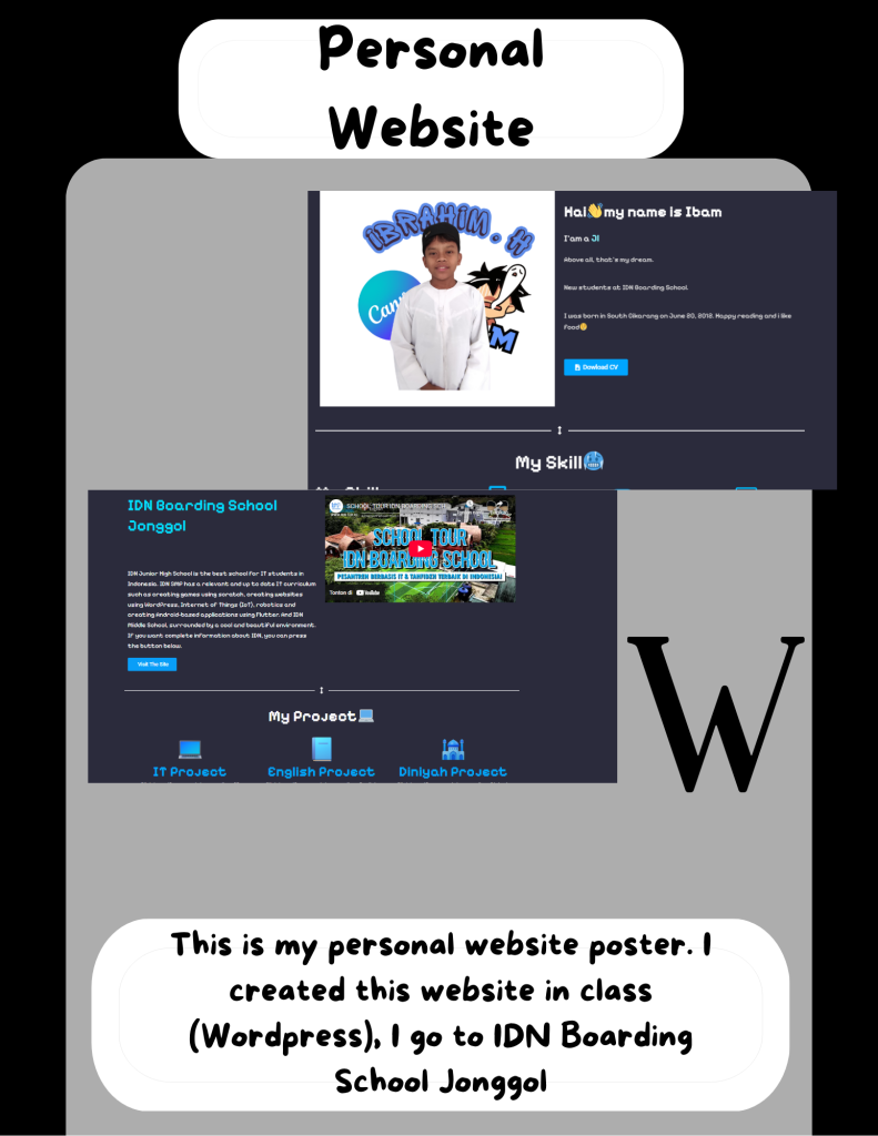Hello, I’m Ibrahim Haidar. You can call me Ibam. Welcome to my website. I created a personal IT project website poster. I created this so I could go home in 3 days. I study at IDN Boarding School Jonggol. I created this website for more than a week because it’s quite difficult and complicated. At first, I was confused because I had never created a website before, but because I’m used to posting projects, it’s easier than before.
